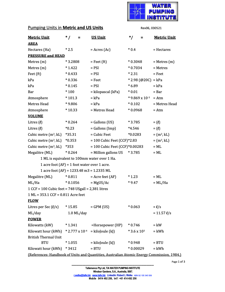 WkW = 0.00982 x Head(m) x Flow (l/s) .......2) Reference